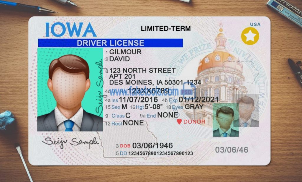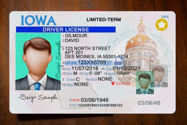 Iowa driver license Psd Template. Fully editable photoshop template.