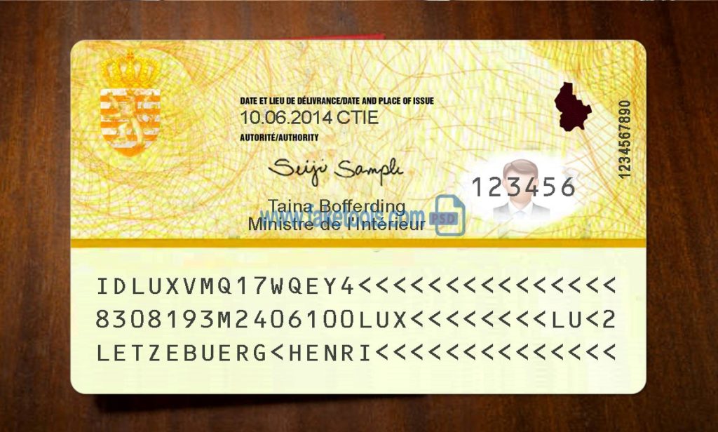 Luxembourg ID Card template. you can edit this template and put any name, address, license number, Id number, birth date, height, weight, expire date, change photos etc.